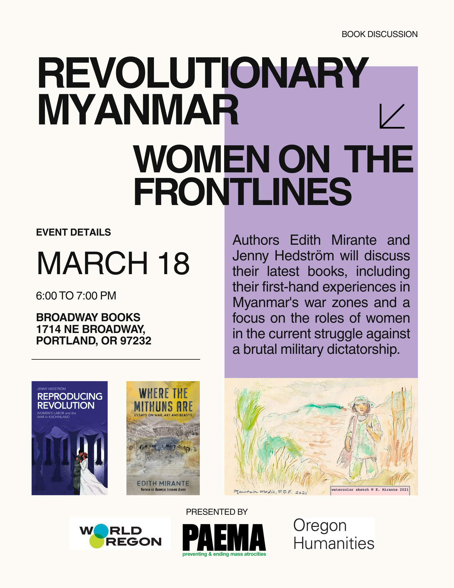 Edith Mirante is the founder of Project Maje, an independent agency that documents human rights abuses in Burma. Her commentaries have been published in Asiaweek and broadcast on BBC World Service. She has lectured for Amnesty International and has testified before Congress. Her new book is Where the Mithuns Are: Essays on War, Art and Beasts, with topics including World War II Burma and the current revolution in Chin State, as well as other locations ranging from Yellowstone National Park to Manzanar to Alaskan tundra.